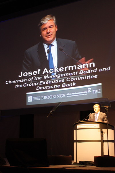 Subtitled “Delivering the Next Economy,” the two-day conference kicked off this morning with a keynote address by Dr. Josef Ackermann, Chairman and CEO of Deutsche Bank. He warned that to restore economic confidence globally there must be a rebalancing — among countries, and between public and private sectors — noting there is a 133% debt-to-global GDP expected in 2020, up from 100% now.